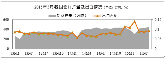 發(fā)稿時間:2015-07-17鋁材市場保持較快增長。監(jiān)控數(shù)據(jù)顯示,自3月以來,我國鋁材月度產(chǎn)量均保持兩位數(shù)的增長速度,其中5月份全國鋁材產(chǎn)量444萬噸,累計同比增長10.7%,增幅環(huán)比回落1.6個百分點。從區(qū)域分布上看,山東、河南以及廣東仍然保持鋁材產(chǎn)量前三的位置,其中廣東5月份鋁材產(chǎn)量49萬噸,全國占比11%,但同比增速較上月回落了6%,降幅收窄0.3個百分點。