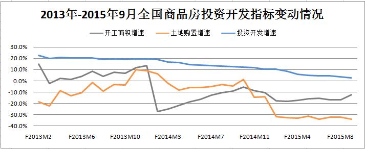 國家統(tǒng)計局?jǐn)?shù)據(jù)顯示,9月份全國商品房土地購置面積累計同比降幅為33.8%,環(huán)比擴大了1.7個百分點;新開工面積累計同比降幅為12.6%,環(huán)比收窄了4.2個百分點;投資開發(fā)額累計同比增長2.6%,環(huán)比收窄了0.9個百分點。受土地購置面積降幅擴大的影響,9月份國房景氣指數(shù)下跌至93.40,環(huán)比輕微下滑了0.06個點。