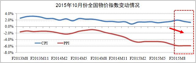 通貨緊縮壓力繼續(xù)增強(qiáng)。綜合分析物價(jià)指數(shù),10月消費(fèi)者價(jià)格指數(shù)(CPI)同比增長1.3%,環(huán)比下降了0.3個(gè)百分點(diǎn);生產(chǎn)者價(jià)格指數(shù)(PPI)同比下降了5.9%,降幅較上月基本持平。與此同時(shí),在全國流通領(lǐng)域50種重要生產(chǎn)資料中,11月上旬價(jià)格下跌的共31種,且集中在金屬及化工領(lǐng)域。以CPI和PPI為主的物價(jià)指數(shù)持續(xù)下行折射出我國面臨通貨緊縮的壓力持續(xù)增強(qiáng)。