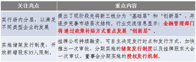 新三板市場(chǎng)再迎里程碑。中國證監(jiān)會(huì)于11月20日發(fā)布了《關(guān)于進(jìn)一步推進(jìn)全國中小企業(yè)股份轉(zhuǎn)讓系統(tǒng)發(fā)展的若干意見》,進(jìn)一步明確了新三板的獨(dú)立市場(chǎng)地位和立足于服務(wù)創(chuàng)新型、創(chuàng)業(yè)型和成長型中小微企業(yè)的市場(chǎng)定位,同時(shí)為企業(yè)在證券市場(chǎng)的轉(zhuǎn)板預(yù)留了空間。此外,《意見》“現(xiàn)階段暫不實(shí)行連續(xù)競(jìng)價(jià)交易”的規(guī)定在一定程度上限制了企業(yè)的板內(nèi)融資便利性。