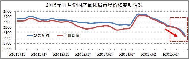 國內價格方面:統計期內,全國氧化鋁市場價格繼續保持了今年以來的下行趨勢,且下行幅度有所擴大。其中:11月國產現貨加權1985元/噸,環比下降8.3%,降幅環比擴大了4.1個百分點;貴州均價1947元/噸,環比下降7.4%,降幅環比擴大了1.4個百分點。研究認為,目前氧化鋁市場價格直線下浮屬于異?,F象,主要原因是電解鋁做空力量加劇了市場悲觀預期。