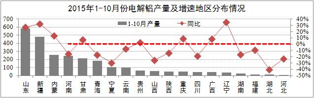 市場供給方面產能方面,10月全國電解鋁建成產能約3800萬噸,運行產能3086萬噸,開工率為81.3%;產量方面,10月電解鋁產量259萬噸,同比增長9.8%,累計同比增長4.8%,其中:山東、新疆、內蒙、河南等省份全國產量占比65%。截至11月18日,電解鋁合計減產389萬噸,占國內總產能的10.3%,其影響效果將于2016年第二季度得到體現。