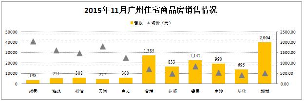 網簽數據顯示,11月份廣州地區住宅商品房共銷售8353套,環比上升1.2%,其中增城區銷售套數位居榜首;全市均價為15657元/平方,環比上升11.6%,其中增城區銷售均價為10608元/平方,略高于花都及從化均價。11月份住宅商品房量價齊漲的主要原因是政策效果顯現,購房需求逐漸增強。