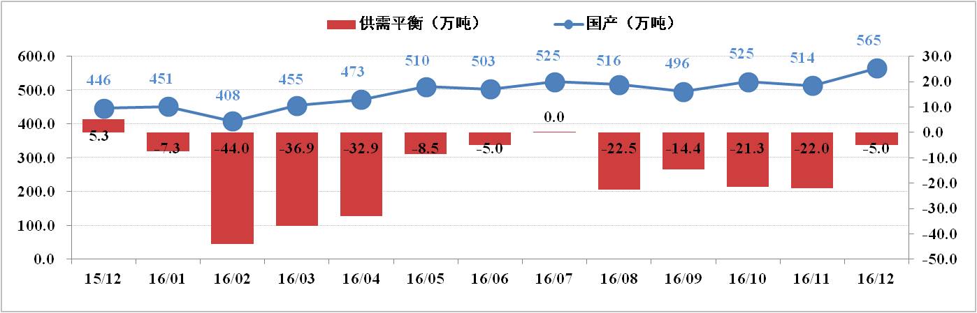 供給方面:12月份全國(guó)電解鋁有效產(chǎn)能為4,219.5萬(wàn)噸,運(yùn)行產(chǎn)能3,615.3萬(wàn)噸,開(kāi)工率為85.68%。其中,12月份電解鋁總產(chǎn)量為294.2萬(wàn)噸,日化產(chǎn)量9.49萬(wàn)噸,供應(yīng)持續(xù)增加。調(diào)研數(shù)據(jù)顯示,2016年國(guó)內(nèi)電解鋁已累計(jì)減產(chǎn)88.4萬(wàn)噸;累計(jì)復(fù)產(chǎn)242.55萬(wàn)噸,待復(fù)產(chǎn)約60萬(wàn)噸;新產(chǎn)能已投產(chǎn)393.8萬(wàn)噸,待投產(chǎn)71萬(wàn)噸。