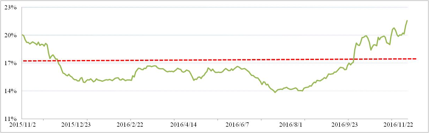 滬鋁三月比例價(jià)方面,11月滬鋁三月合約下行趨勢(shì)明顯,月末加權(quán)平均價(jià)報(bào)收于13,118元/噸。若按17.6%氧化鋁作價(jià)比例,2017年1月份全國(guó)氧化鋁長(zhǎng)單加權(quán)價(jià)格為2,309元/噸,與現(xiàn)貨加權(quán)價(jià)格的價(jià)差擴(kuò)大到646元/噸。12月份期鋁全國(guó)氧化鋁現(xiàn)貨加權(quán)價(jià)與滬鋁三月加權(quán)平均價(jià)實(shí)際折算比例為22.95%。