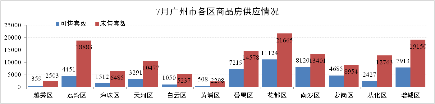 7月31日,廣州市新建住宅商品房共189,053套。其中:可售住宅商品房為52,695套,占比27.85%;未售住宅商品房136,394套,占比72.15%。花都、增城、番禺、荔灣庫存量較高,可售和未售房源累計占全市比例分別為58.31%和54.46% 。