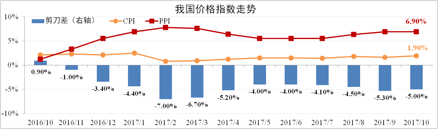 10月份我國CPI為1.9%,較上月擴大0.3個百分點,主要受食品價格跌幅縮小以及服務價格上漲所致。10月PPI為6.9%,超出市場預期,有色金屬礦石開采以及石油價格上漲是主要支撐力量。
