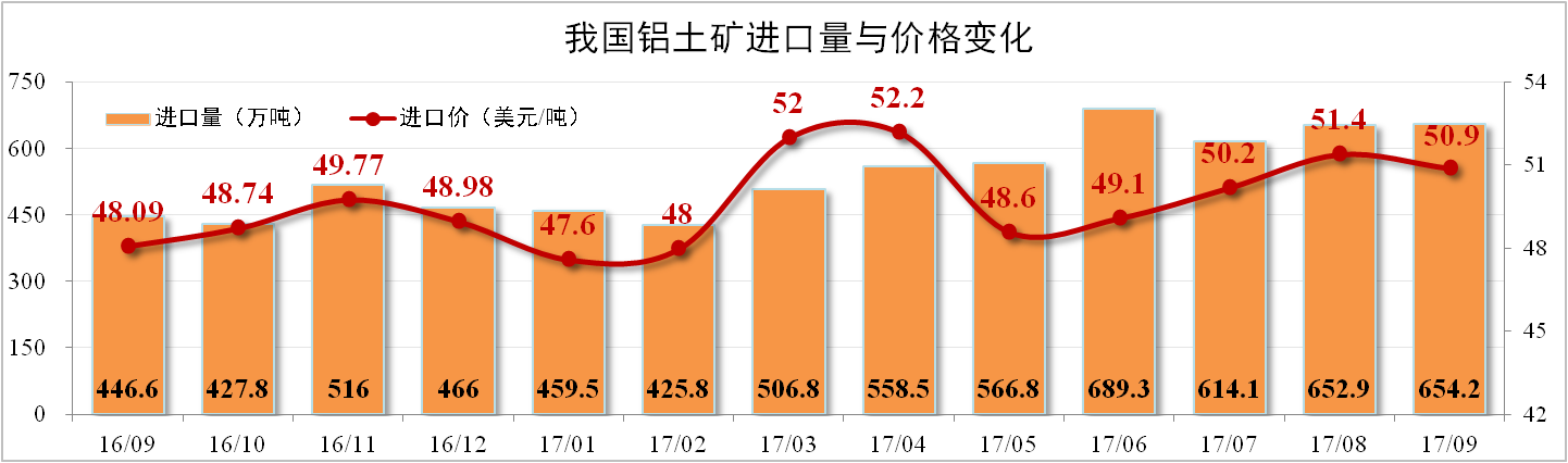 9月我國鋁土礦進(jìn)口量達(dá)654.2萬噸,同比增長46.48%,環(huán)比增長0.2%。其中澳洲進(jìn)口量達(dá)283萬噸創(chuàng)下歷史新高。鋁土礦進(jìn)口價(jià)格微幅下降至50.9美元/噸,環(huán)比下降0.97%。