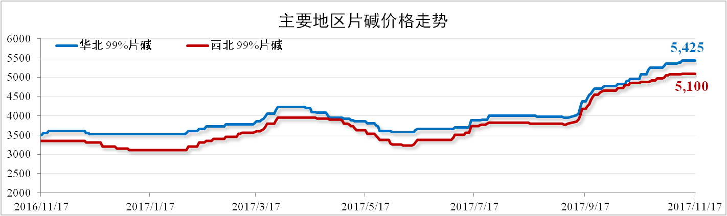 10月片堿庫存水平保持低位,片堿企業(yè)預(yù)售11月訂單,導(dǎo)致片堿報(bào)價(jià)維持高位。截至11月17日,華北地區(qū)99%片堿報(bào)價(jià)5,425元/噸,環(huán)比上漲11%;西北地區(qū)99%片堿報(bào)價(jià)5,100元/噸,環(huán)比上漲6% 。