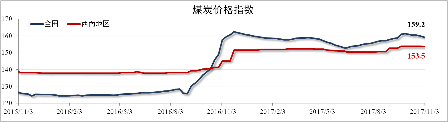 日前國家發(fā)改委召開新聞發(fā)布會(huì),表示將力控冬季供暖期間煤炭價(jià)格。截至11月3日,中國煤炭價(jià)格指數(shù)報(bào)159.2點(diǎn),環(huán)比下降0.5%,西南地區(qū)煤炭價(jià)格指數(shù)報(bào)153.5點(diǎn),環(huán)比下降0.07%。