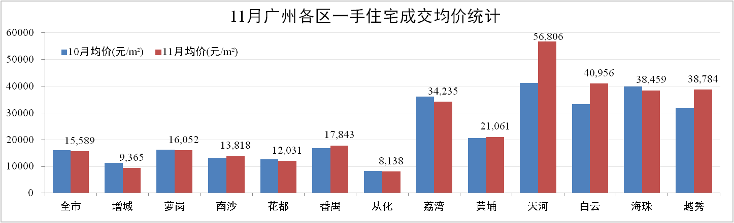 網簽價方面:11月份廣州一手住宅成交均價15,589元/m2,環比下跌3.10%。其中,增城成交均價僅為9,365元/m2,環比下跌16.72%。市內核心區域均有不同程度升幅,整體拉動市場均價平穩。