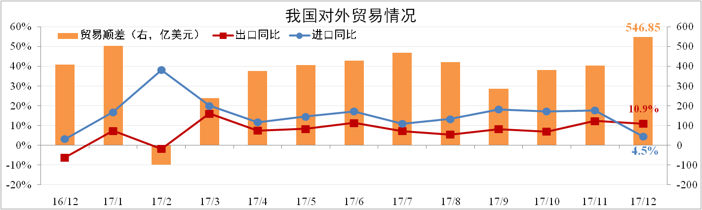 分析認為:內需轉弱導致原材料進口量大幅下降致使進口增速大幅下滑。美國頻繁挑起貿易摩擦會對我國2018年出口造成影響,而國內經濟增速趨緩致使進口增速也面臨回調壓力。預計2018年進出口雙雙回落。