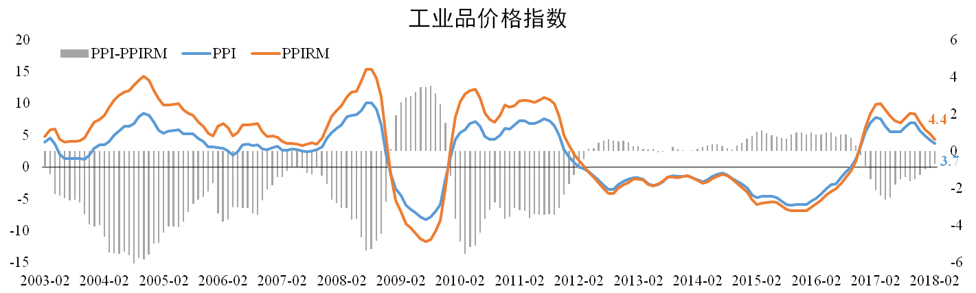 分析認(rèn)為:PPI與PPIRM增速差距收縮反應(yīng)工業(yè)企業(yè)盈利能力逐步改善。而受供給側(cè)改革力度邊際走弱以及終端需求放緩影響,疊加高基數(shù)效應(yīng),3月份PPI增速將繼續(xù)下滑。