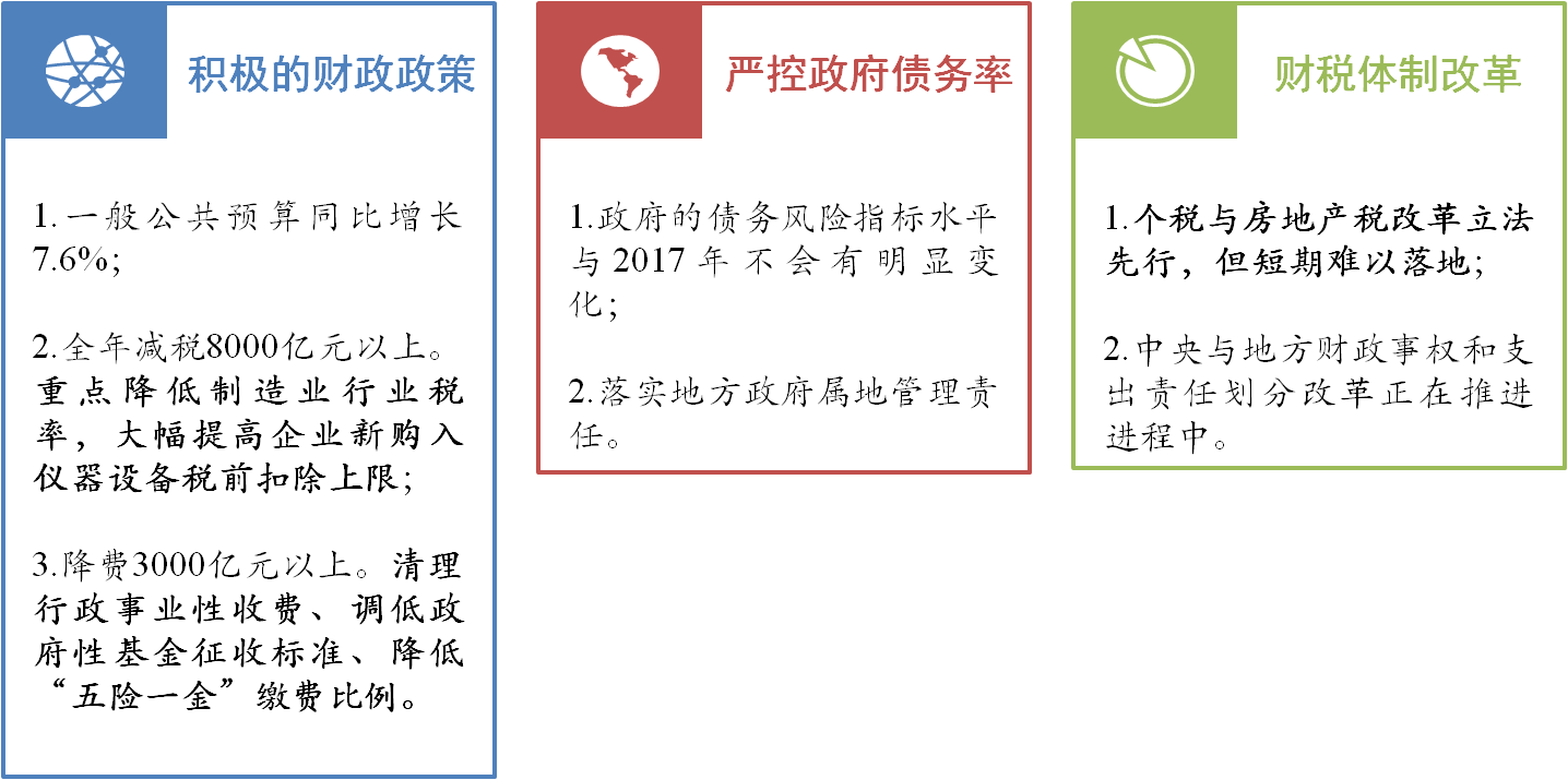 分析認為:地方政府專項債、中央基建投資分別較2017年增加5500億、300億元,因此今年財政政策較去年只強不弱。另外減稅降費將進一步降低企業稅負,提高企業競爭力,釋放市場活力。