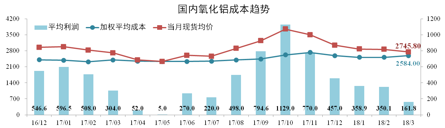 3月份國內(nèi)氧化鋁加權(quán)平均成本為2,584元/噸,環(huán)比上漲2.87個百分點。當(dāng)月全國氧化鋁現(xiàn)貨成交均價為2,745.8元/噸,較上月下跌4.06%。理論氧化鋁行業(yè)平均利潤水平為161.8元/噸。