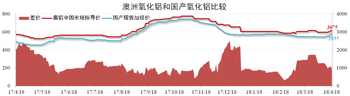 截至4月18日,國產(chǎn)氧化鋁現(xiàn)貨加權(quán)均價為2895元/噸,同比上升18.03%,環(huán)比上升5.82%。澳鋁中國市場指導(dǎo)價為3075元/噸,環(huán)比上升1.65%,二者價差180元/噸,較上月同期縮窄109元/噸。