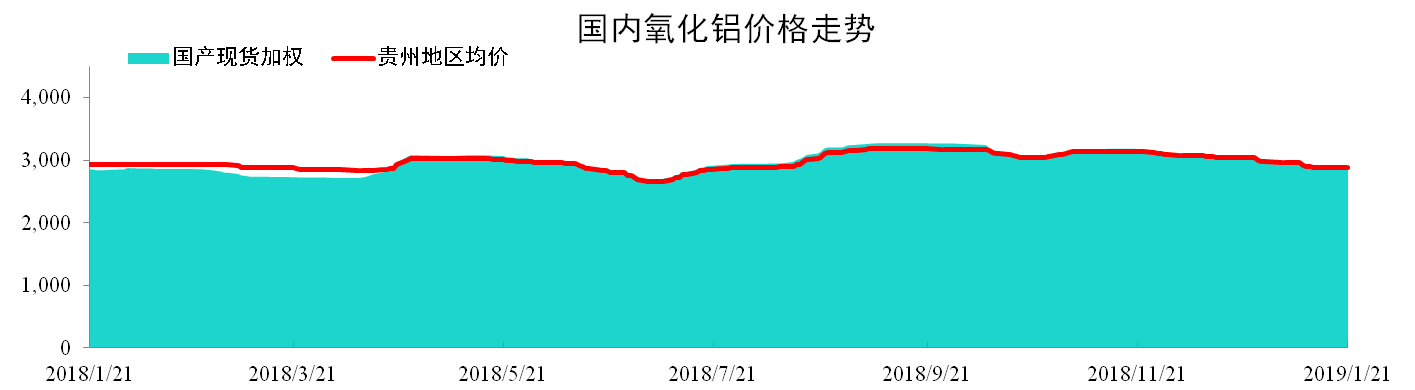 截至1月21日,國產氧化鋁現貨加權均價為2871元/噸,同比上漲0.56%,環比下降4.92%。貴州地區氧化鋁現貨加權均價為2882元/噸,同比下降2.36%,環比下降5.51%。