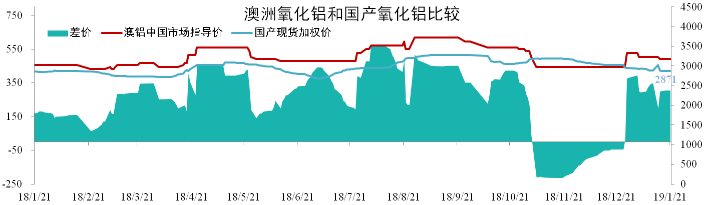 截至1月21日,國產氧化鋁現貨加權均價為2871元/噸,環比下降4.92%。澳鋁中國市場指導價為3175元/噸,同比上漲4.96%,國產氧化鋁價格較澳鋁指導價低304元/噸。