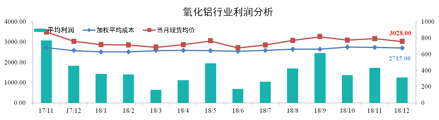 12月份國內氧化鋁加權平均成本為2715元/噸,較上月下降0.80%。當月全國氧化鋁現貨成交均價為3028元/噸,較上月下降4.51%。理論氧化鋁行業平均利潤水平為313元/噸。