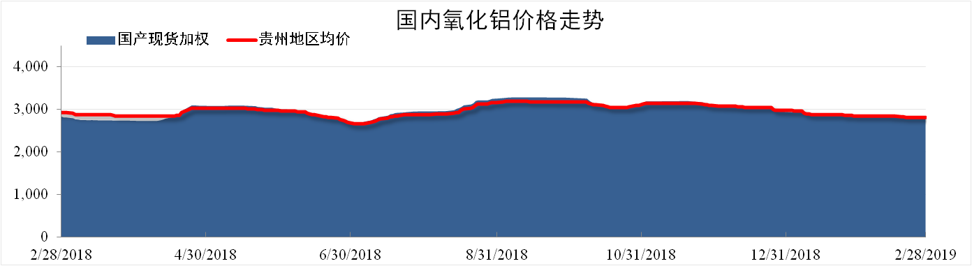 截至2月28日,國產(chǎn)氧化鋁現(xiàn)貨加權(quán)均價為2812元/噸,同比下降0.81%,環(huán)比下降2.18%。貴州地區(qū)氧化鋁現(xiàn)貨加權(quán)均價為2829元/噸,同比下降3.37%,環(huán)比下降2.22%。