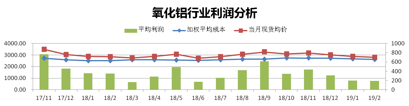 2月份國內(nèi)氧化鋁加權(quán)平均成本為2622元/噸,較上月下降2.02%。當(dāng)月全國氧化鋁現(xiàn)貨成交均價為2812元/噸,較上月下降2.19%。理論氧化鋁行業(yè)平均利潤水平為190元/噸。