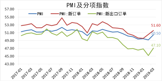 據國家統計局數據,3月PMI上升至50.5%,打破連續三月低于榮枯線下方的局面。分項來看,新訂單指數連續兩月上揚,預示著制造業減稅降費等一系列積極的財政政策效果開始逐步釋放。從需求方面來看,進口、新出口訂單指數仍低于50%,在一定程度上說明內外需均未發生實質性改善,終端消費不振仍成為制約制造業擴張前景的重要因素。