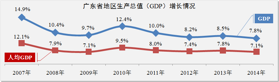廣東經濟方面。2014年廣東實現地區生產總值6.8萬億,全國占比10.7%,同比增長7.8%,較全國增速多0.4個百分點。其中第一產業增長3.3%,第二產業增長7.7%,第三產業增長8.2%。人均GDP方面,全年人均GDP同比增長7.1%,絕對收入首次超過1萬美元。總體而言,2014年全省經濟運行雖有所回落,但運行基調基本平穩。