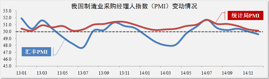 制造業方面。2014年末我國制造業采購經理指數(PMI)下跌至50.1%,逼近50%的臨界點。匯豐PMI跌至49.6%,較統計局發布PMI低0.5個百分點,我國中小企業的發展速度明顯放緩。12月份PMI數據回落至臨界點具有季節性因素影響,但從全年變動趨勢上看,PMI及匯豐PMI的持續下滑說明我國制造業發展所面臨的壓力正不斷地擴大和增強。