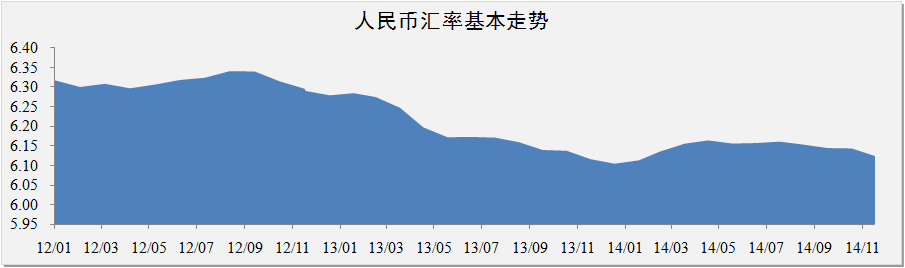 人民幣幣值方面。2014年12月份人民幣匯率為6.12,人民幣幣值環比上升0.3%,全年匯率在6.10-6.16區間內小幅震蕩。自美國全面退出QE后,市場對人民幣貶值的預期風險逐步增強。但由于國家當局頻繁在東南亞及中東等地區推行人民幣跨境結算業務,人民幣的國際貨幣屬性逐步增強,貶值風險一定程度上被有效稀釋。從中長期看,人民幣仍將有較為明顯的升值動力,但升值幅度有限。